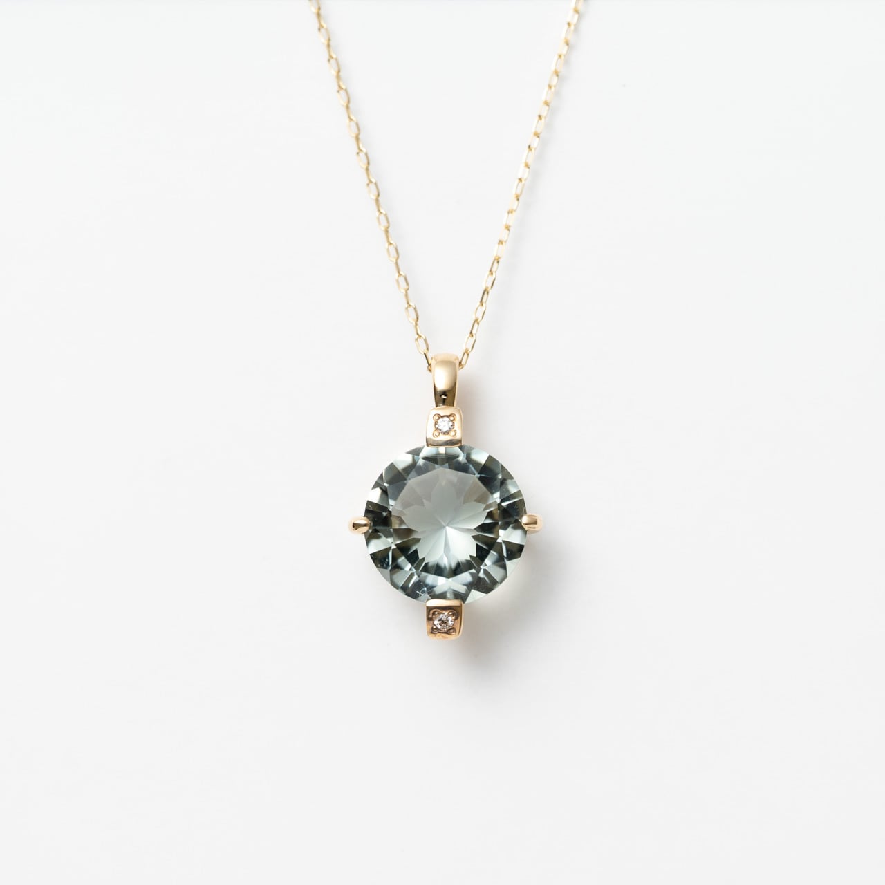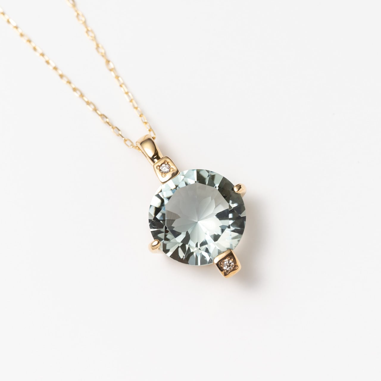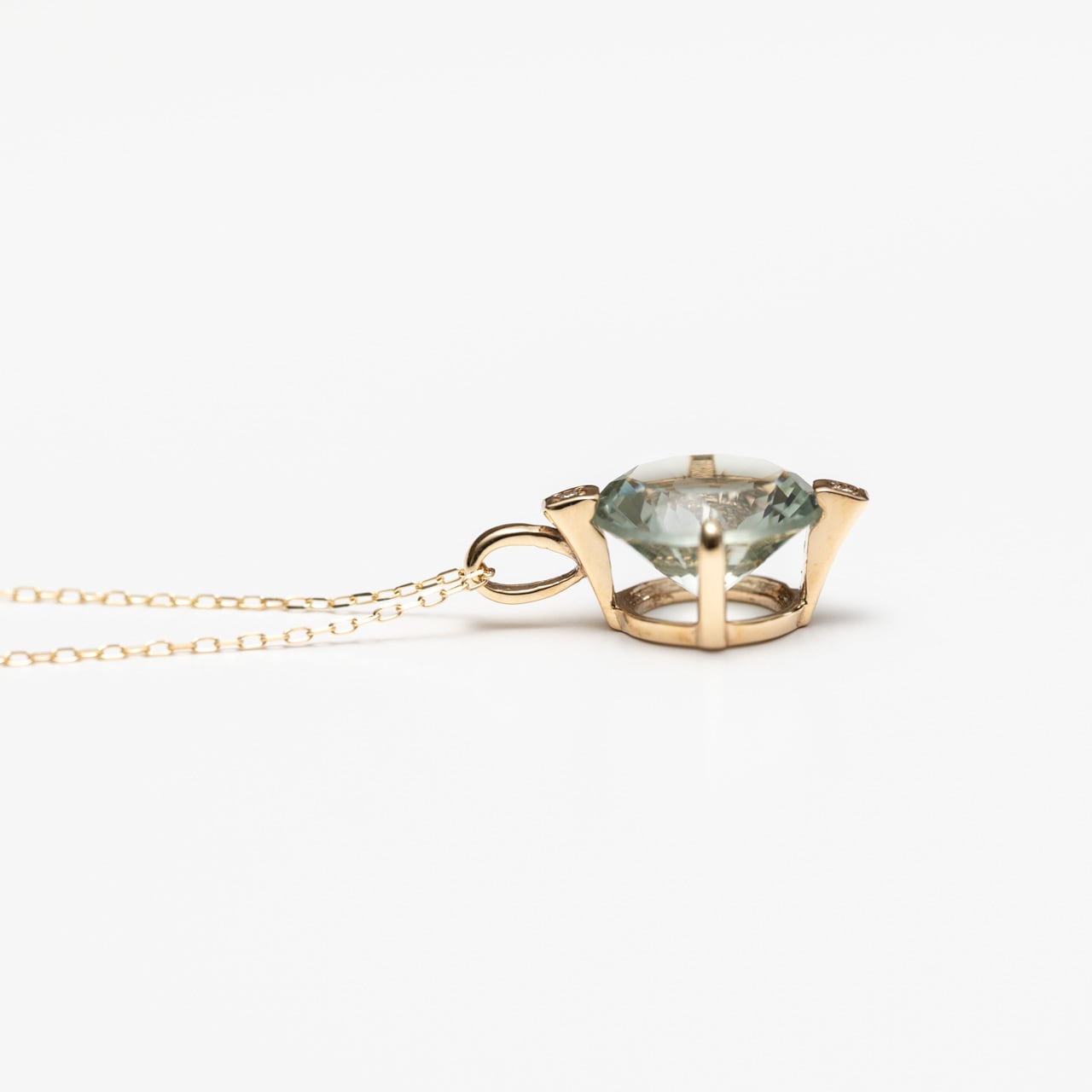 山梨の宝石研磨工房「シミズ貴石」のオリジナルカット、「さくらインカット」のグリーン・クォーツをペンダントにしました。
